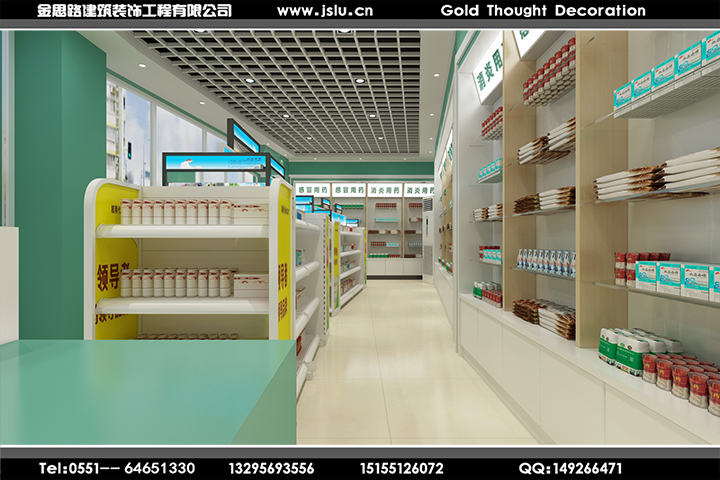 顏色不宜太亮,也不宜太光明了,一般以簡潔明了來滿足大家了;藥店對店鋪層高的要求一般在3米以上,但由于所選擇的店面多數(shù)處于底層,天花板下多數(shù)有下水管、電線管、消防管等管道,這時不要安裝吊頂天棚將這些管道隔離,只要這些管道粉刷成純白色,并將光源置于管道之下即可,這樣既可以保證商店的空間,又可以節(jié)省費用。